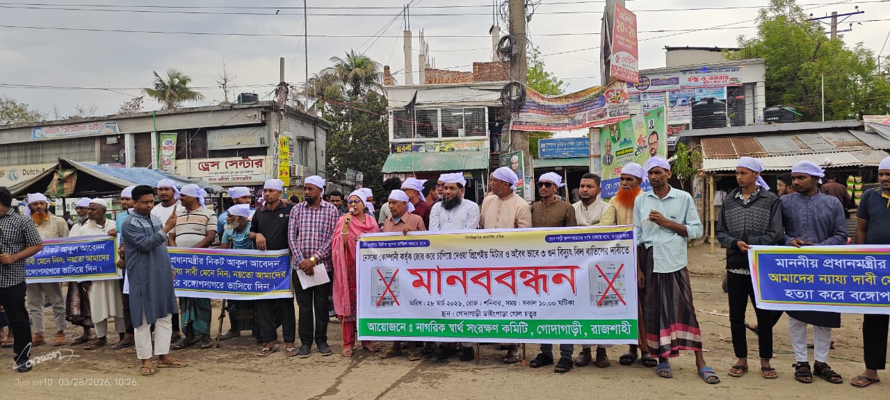 রাজশাহীর গোদাগাড়ীতে প্রিপেইড বিদ্যুৎ মিটার স্থাপনের বিরুদ্ধে ক্ষোভ প্রকাশ করে মানববন্ধন কর্মসূচি পালন করেছে স্থানীয় ভুক্তভোগী সাধারণ জনগণ। নেসকো কর্তৃপক্ষের বিরুদ্ধে জোরপূর্বক মিটার স্থাপন এবং অতিরিক্ত বিল আদায়ের অভিযোগ তুলে এ কর্মসূচি অনুষ্ঠিত হয়।