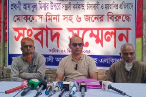 আজ ০২ ডিসেম্বর মঙ্গলবার ১২ ঘটিকার সময় মদিনাতুল উলুম কওমী মাদ্রাসা প্রাঙ্গণে সংবাদ সম্মেলন করে দোষীদের বিচার দাবি করেন ভুক্তভোগী প্রবাসী আসাদুল ইসলাম। সংবাদ সম্মেলনে প্রবাসী আসাদুল মিনা বলেন,তাতিকান্দা ২নং ব্রীজের দক্ষিন পাশে ২৮ নং নাগরদি মৌজায় তিনটি দলিল মূলে ৩৫ শতাংশ জমি ক্রয় করি এবং মিউটেশন করে চারিদিকে ইটের বাউনন্ডারি নির্মাণ করে দখলকার অবস্থায় আছি। গত ২১ নভেম্বর ২০২৫ শুক্রবার আমি আমার জমিতে মিনা অটো রাইস মিলস নির্মান কাজ শুরু করলে একই এলাকার বর্তমান মেম্বার মোকলেস মিনা, মোতালেব মিনা, মাহাবুর মিনা, রাঙ্গু মিনা,সম্রাট মিনাসহ অজ্ঞাত নামা ৪/৫ জন তারা নির্মাণ কাজে বাধা দিয়ে নগদ পচিশ লক্ষ টাকা চাঁদা দাবি করে। তাদের দাবি না মানায় প্রান নাশের হুমকি দিয়ে আমাকে মারধর করে আমার কাছে থাকা নগদ বিশ হাজার পাচঁশত টাকা নিয়ে যায়। এ ঘটনায়