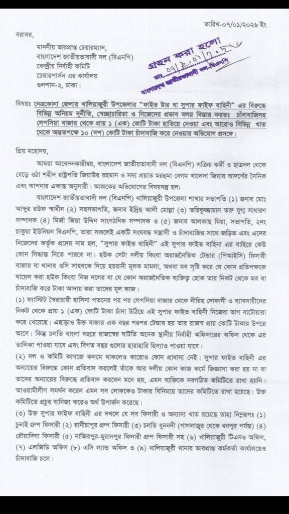 খালিয়াজুরি উপজেলার বল্লী গ্রামের মোঃ আক্তারুজ্জামান ও মোহনগঞ্জ উপজেলার কলুংকা গ্রামের জাহাঙ্গীর আলম খান স্বাক্ষরিত অভিযোগে উল্লেখ করা হয়েছে খালিয়াজুরী উপজেলার বিএনপির সভাপতি আঃ রউফ স্বাধীন, সহসভাপতি ইদ্রিস আলী মোল্লা, যুগ্ম সাধারণ সম্পাদক তরিকুজ্জামান তরু, সাংগঠনিক সম্পাদক মির্জা জিয়া উদ্দিন ও আলকাছ মিয়া , সভাপতি ২ নং ইউনিয়ন বিএনপি। তারা ৫ জন স্বঘোষিত সুপার ফাইভ বাহিনী।