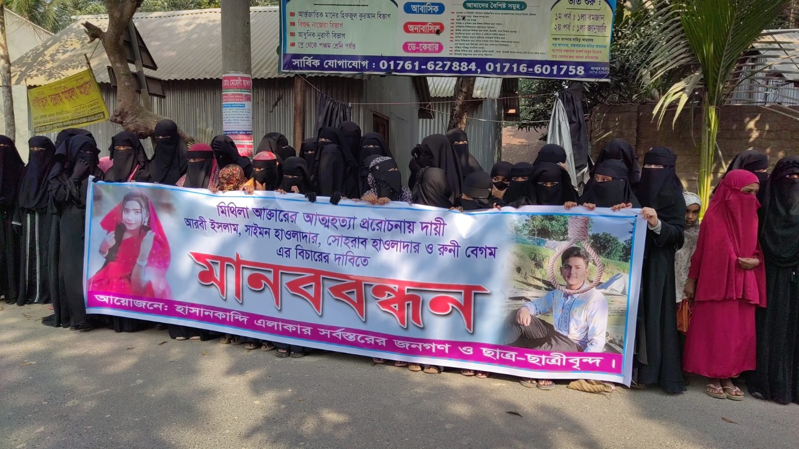 মাদারীপুরের রাজৈরের হাসানকান্দিতে মাদ্রাসার ছাত্রী মিথিলা আত্ন হত্যায় প্ররোচনায়কারীদের শাস্তির দাবীতে মানববন্ধন ও প্রতিবাদ সমাবেশ করছে এলাকায়বাসী ও মাদ্রাসার ছাত্রীরা।
